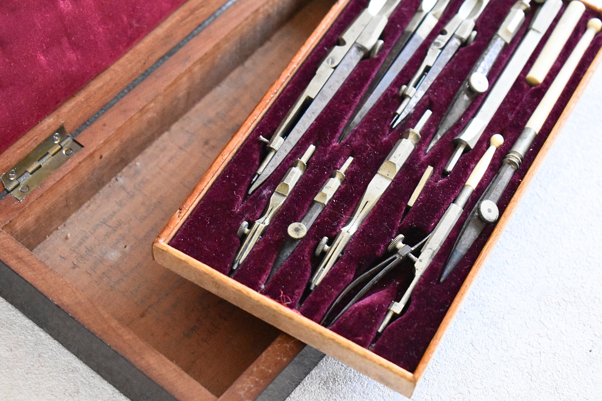 - Contents: Multiple compasses, dividers, and attachments in fitted velvet tray