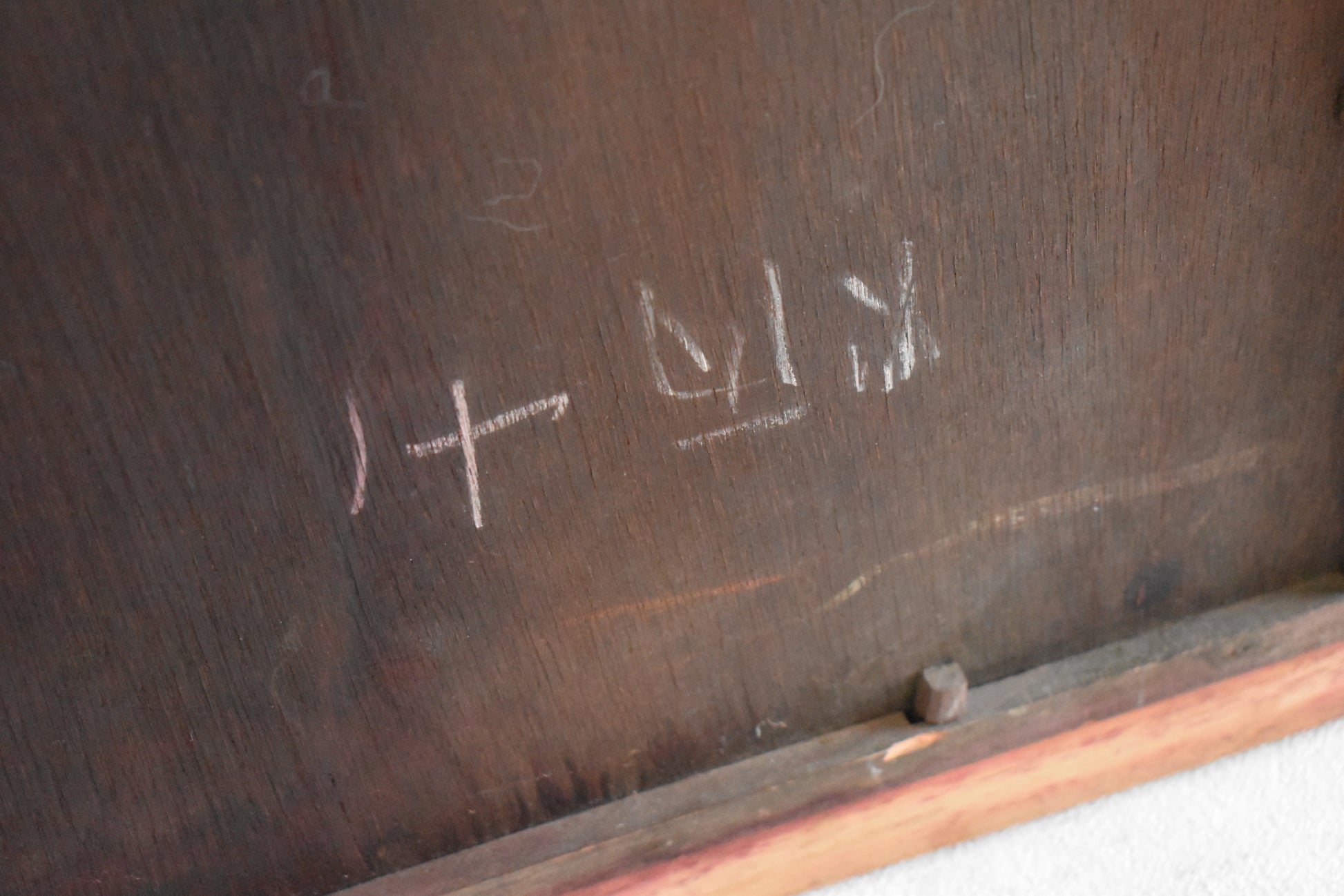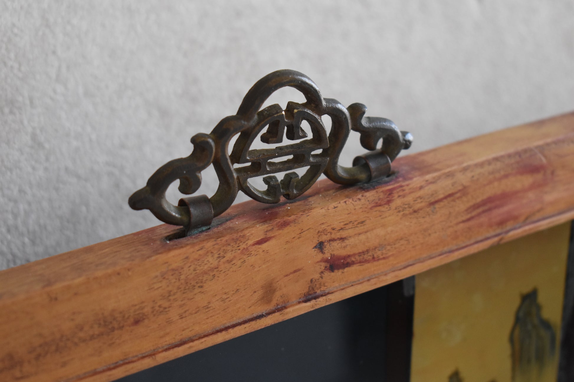 This exquisite Chinese reverse glass painting captures a graceful courtesan poised mid-step in an elegant imperial setting, bathed in refined details and symbolic scenery. The richly colored robe, the delicate flowering branch, and the distant mountains evoke a timeless narrative steeped in beauty and tradition. Likely originating from early 20th century China, this work is rendered using the églomisé technique—painting on the reverse of glass—lending the scene a luminous depth and unique visual clarity. Framed in a natural wood border with a carved brass hanger, it exudes antique charm and classic Chinese aesthetics.