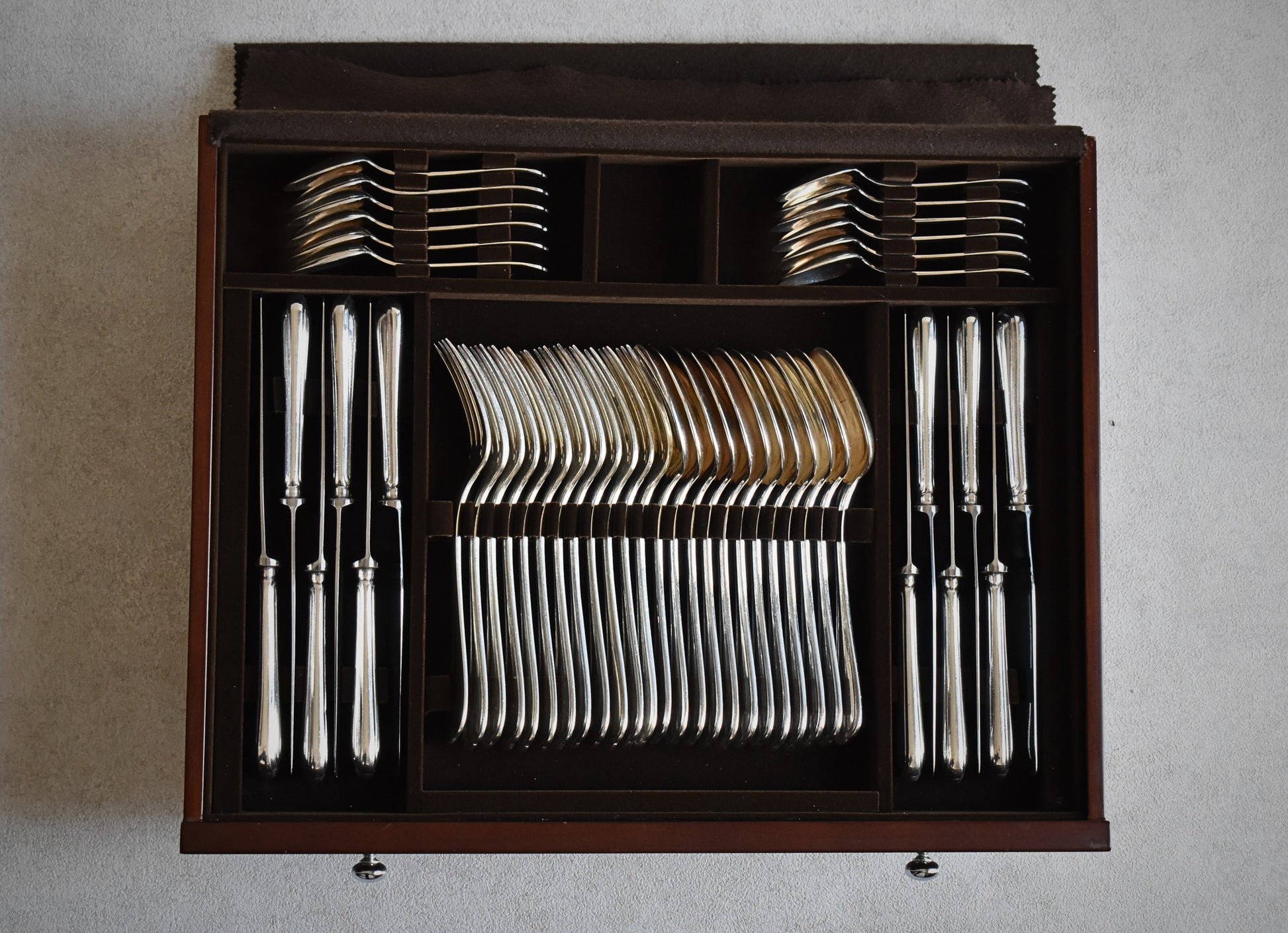 - Set Includes: 12 table forks, 12 table knives, 12 soup spoons, 12 oyster forks, 12 dessert forks, 12 dessert knives, 12 dessert spoons, 12 fish forks, 12 fish knives, 1 serving spoon, 1 serving fork, 1 soup ladle, and 1 pie server