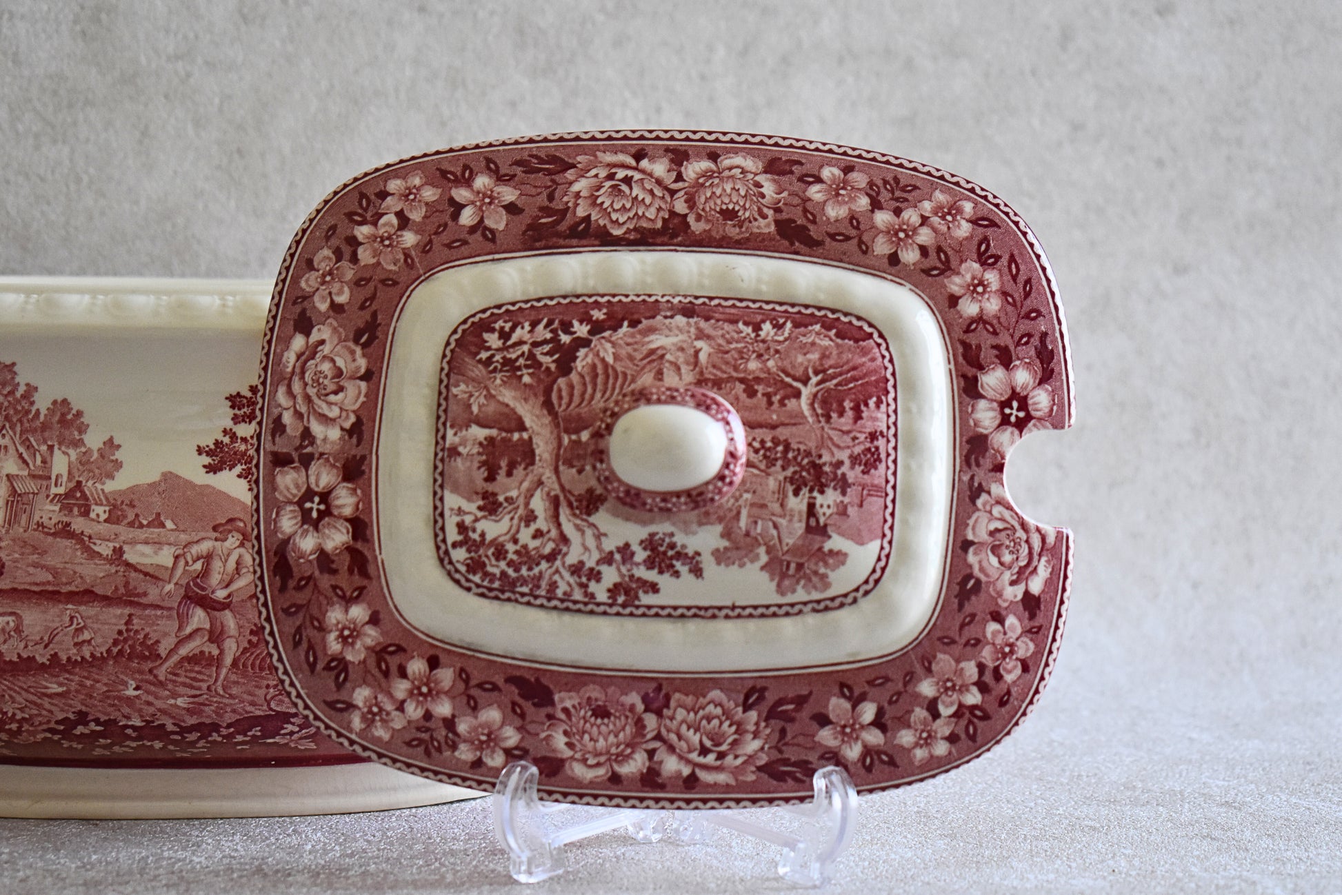 This elegant covered tureen from Villeroy & Boch’s celebrated Rusticana pattern captures the timeless charm of pastoral life. Crafted in France between 1983 and 1991, the piece features a deep raspberry red transferware scene that transports you to idyllic countryside settings, complete with farmhouses, trees, and romantic vignettes of rural figures tending the land. Its creamy ceramic base contrasts beautifully with the fine detailing, and the lid fits snugly with a decorative finial and a practical ladle notch.