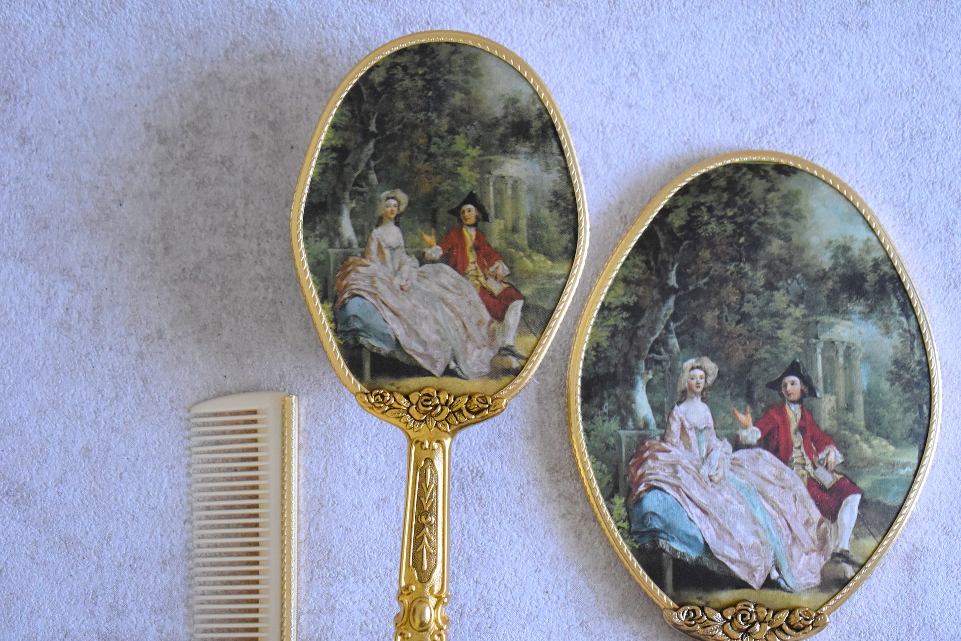 This elegant three-piece vanity set—mirror, brush, and comb—captures the opulence and charm of mid-20th-century French decorative arts. Designed in the Rococo Revival style with Louis XVI influences, it features intricately molded gilt handles adorned with floral motifs. The back of the mirror displays a romantic pastoral scene inspired by 18th-century courtship paintings, evoking a sense of aristocratic refinement.