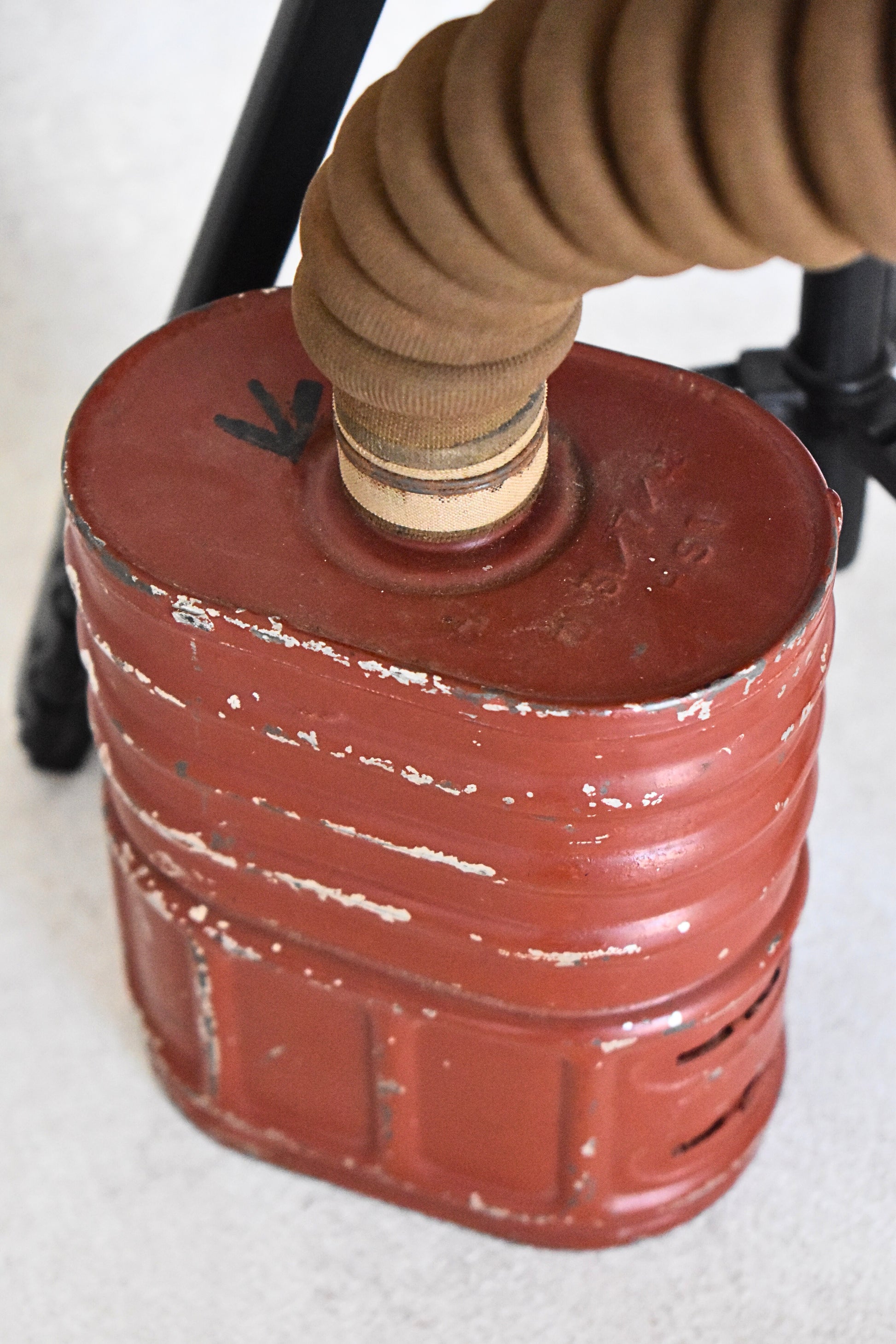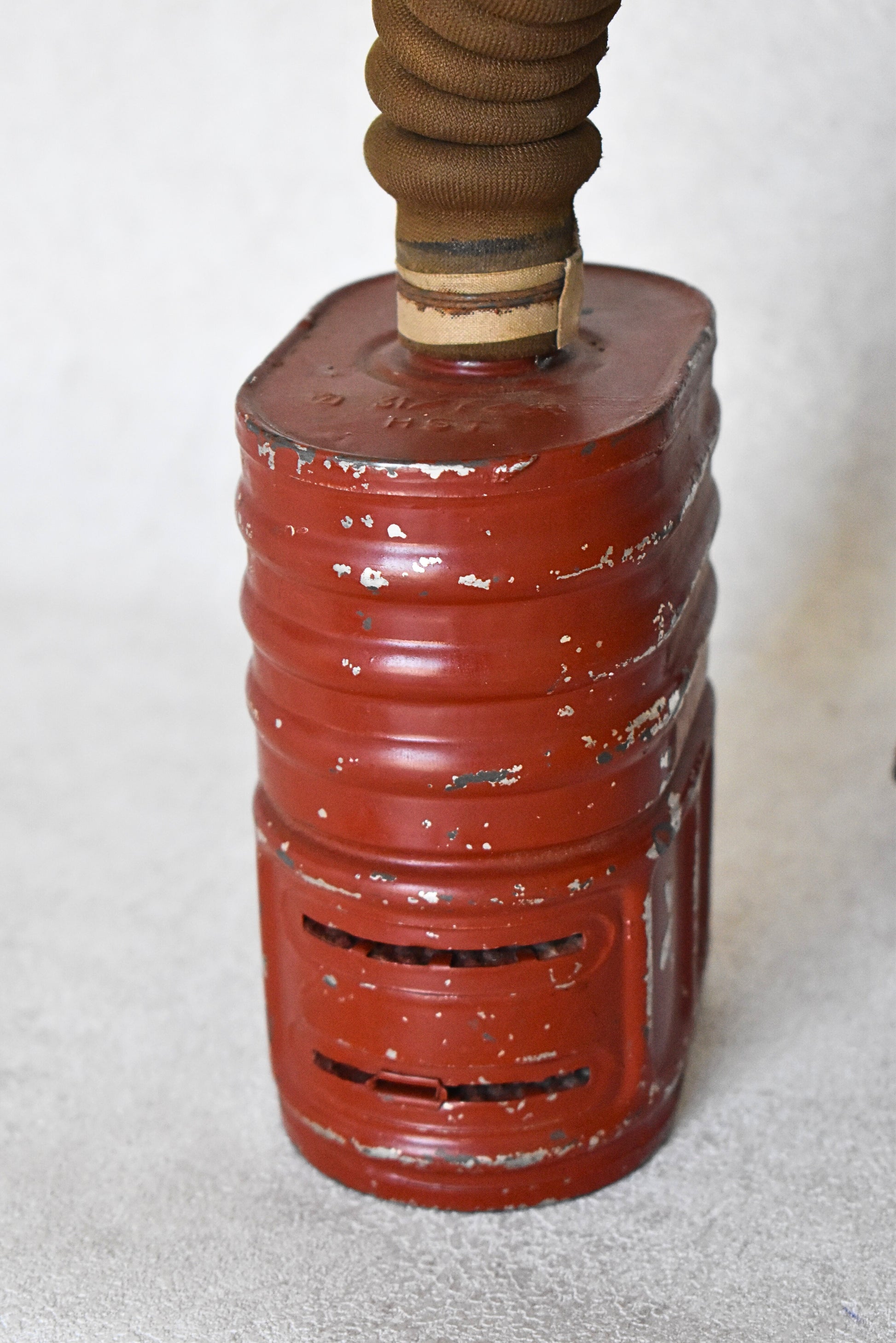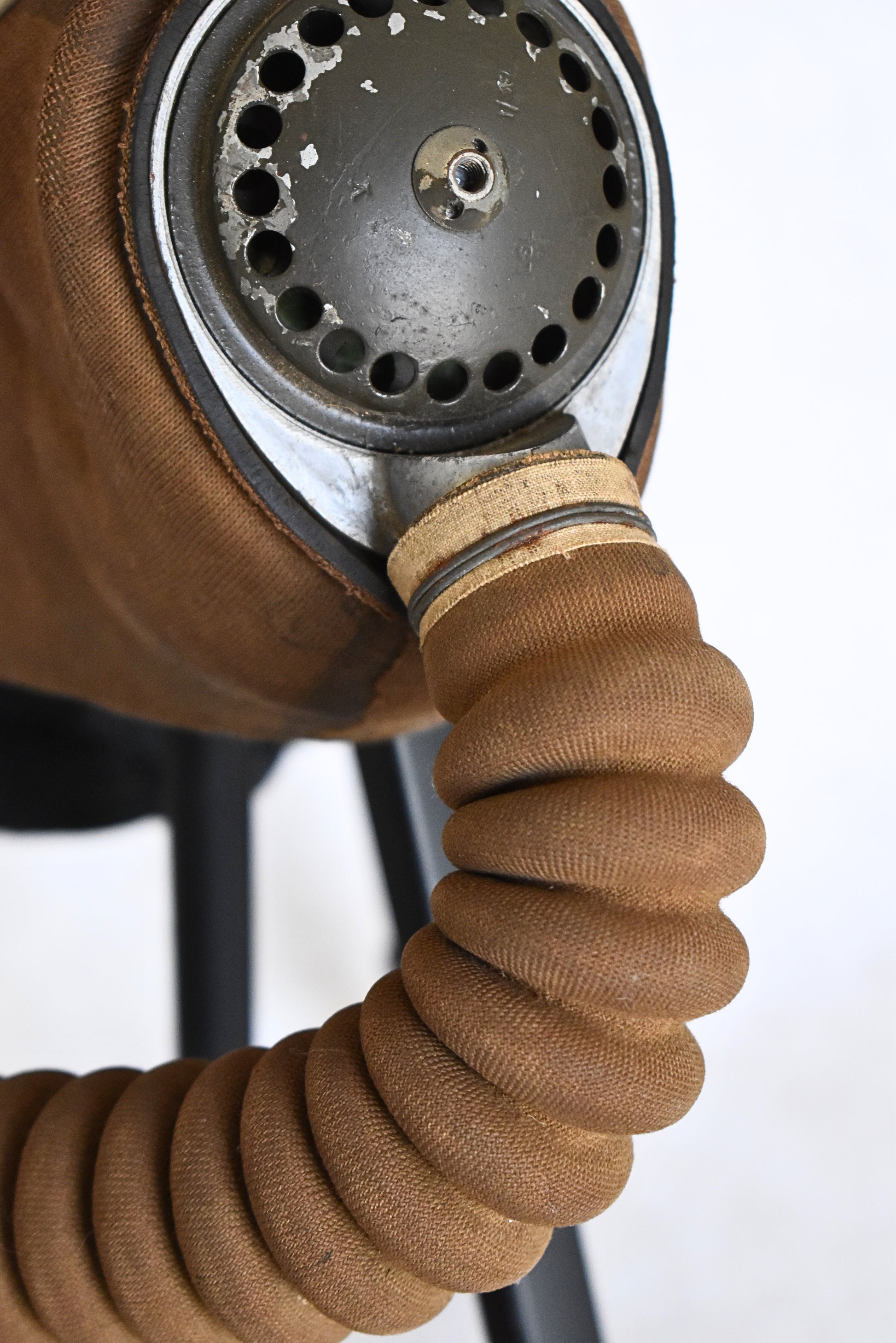 - Material: Brown fabric over molded rubber, metal fittings, ribbed hose, steel canister